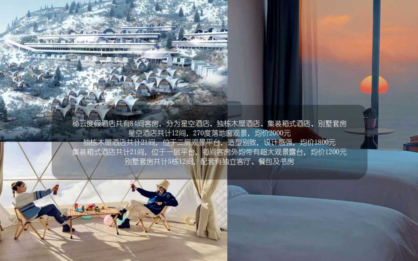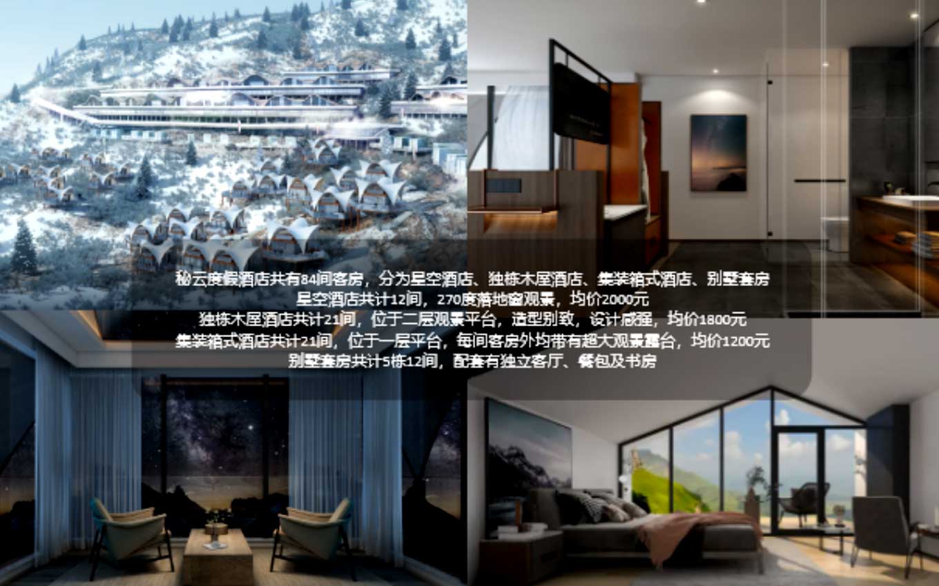 亞洲最美360°觀景平臺——牛背山,秘云星空度假村駕露宿占地面積40畝,有著大型的地下停車場,酒店住宿,餐館,度假旅游招待核心等服務項目服務設施,集裝箱房屋17家,星空帳篷酒店13家,固定不動醫院病床50張,標間20間,大被單間10間,露營帳篷50間;可與此同時招待150人。