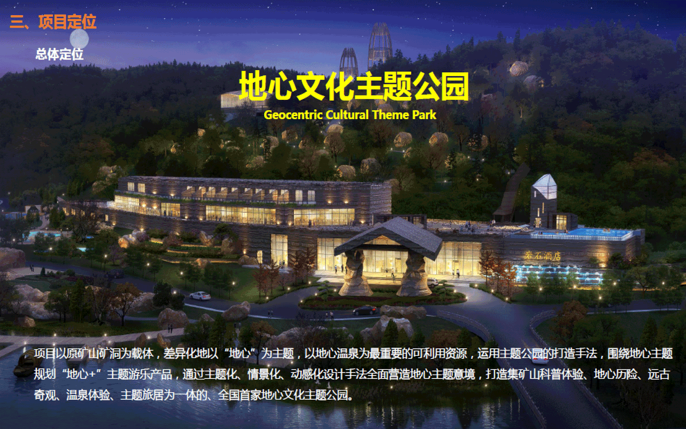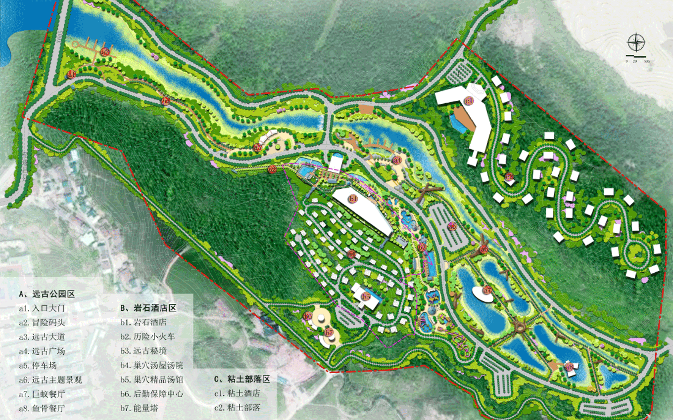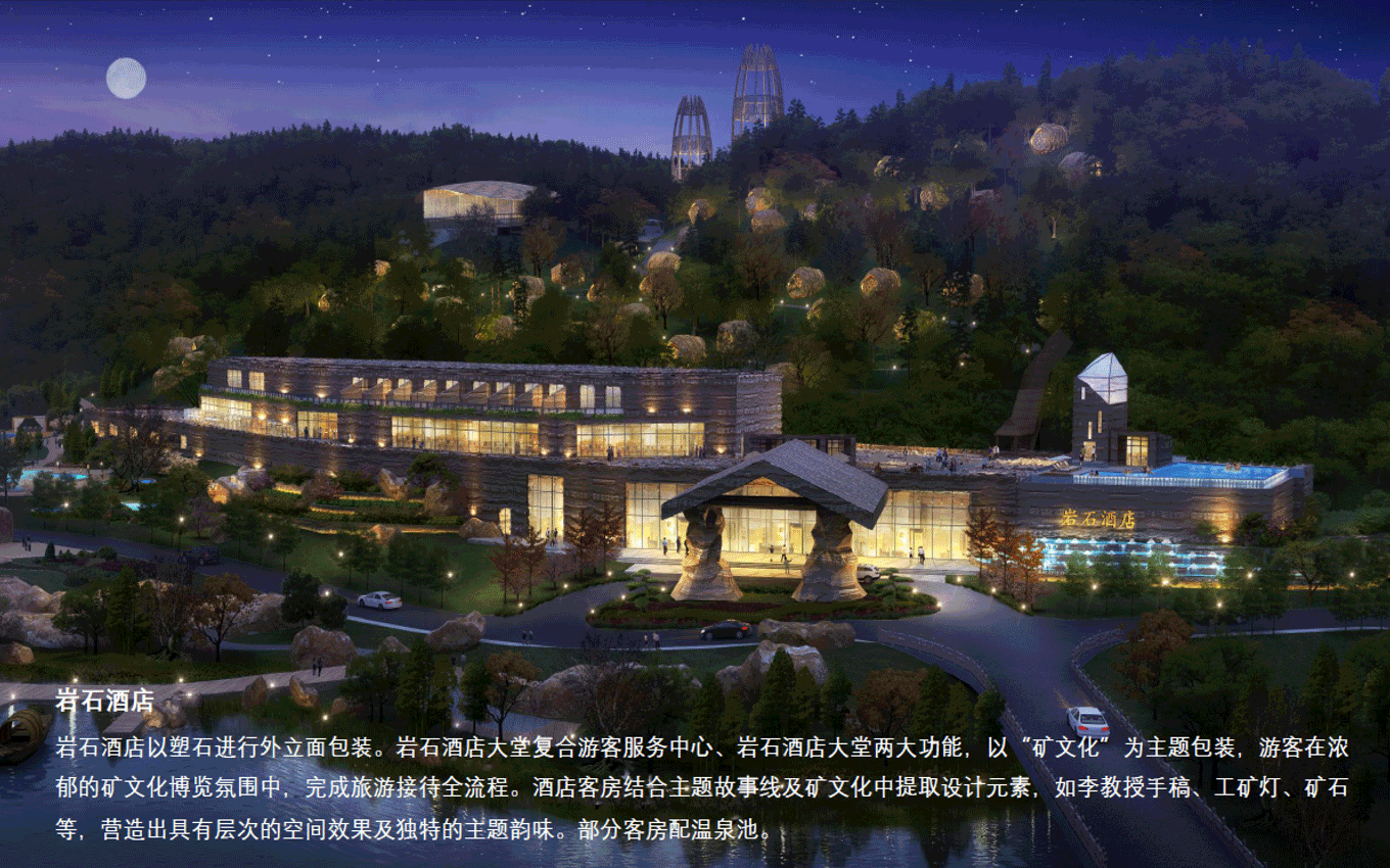 遠古公園景區,位于規劃區中部,為東西走向的兩山相夾谷地地形東部直接連接605縣道,西部與農田相接。絕大部分為原礦山尾水排放區域,業主方要求打造成濕地公園遠古公園度假景區功能定位,景區形象展示、停車服務、休閑公園、污水凈化、主題餐飲。目標市場為家庭游和主題游樂客群;策劃理念是利用交通對接便利的條件,展示地心公園主題形象和主題景觀,配建停車、餐飲等配套服務功能,遠古公園以遠古濕地為形態,以遠古荒蕪為景觀風格,實現遠古公園與地心公園整體風格的協調統一。