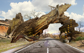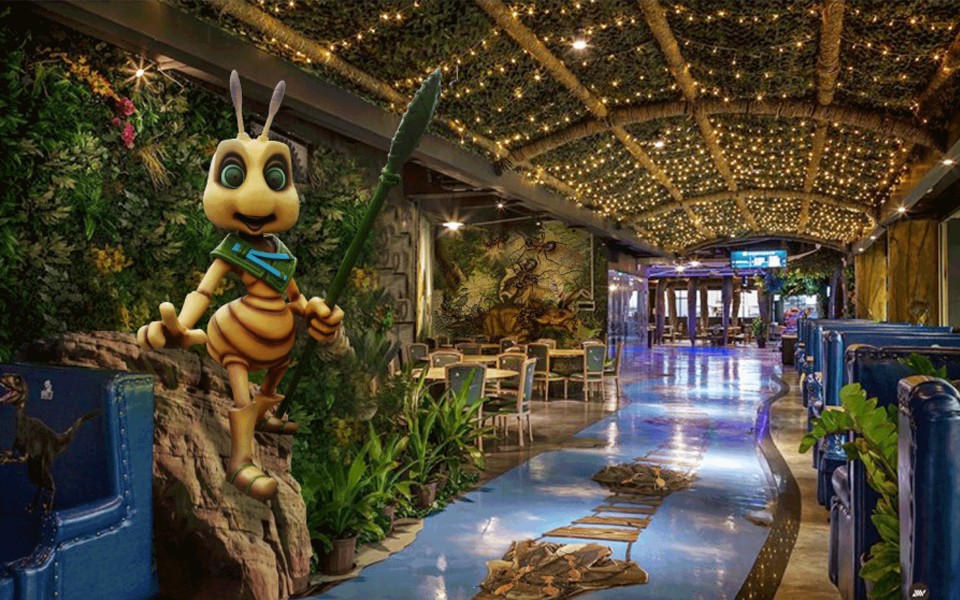 度假溫泉度假區入口大門/遠古大道/遠古廣場/遠古主題景觀圍繞地心文化主題,提取巨型動物化石、枯樹木、獸骨、蛛網、石堆、龍蛋及主題故事線中IP形象等元素進行主題包裝,營造遠古時期原始、神秘、荒蕪的主題場景,激發游客的好奇心,快速進入設定的的主題故事中。